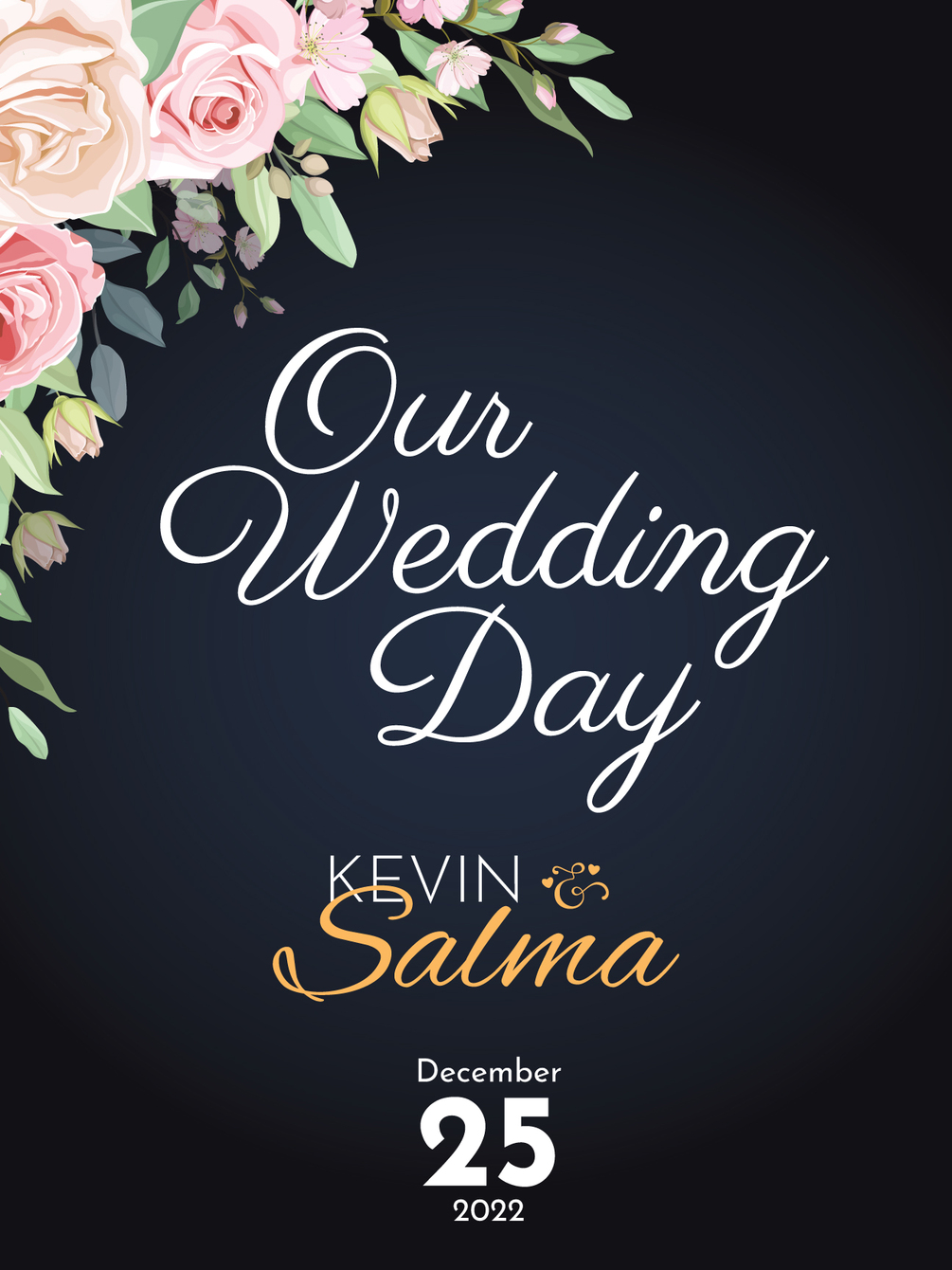 Decorate your wedding hall entrance with a pretty simple welcome sign containing both partners' names and the wedding date celebrating it with some flowers on a navy blue simple gradient background going with some white & golden text.